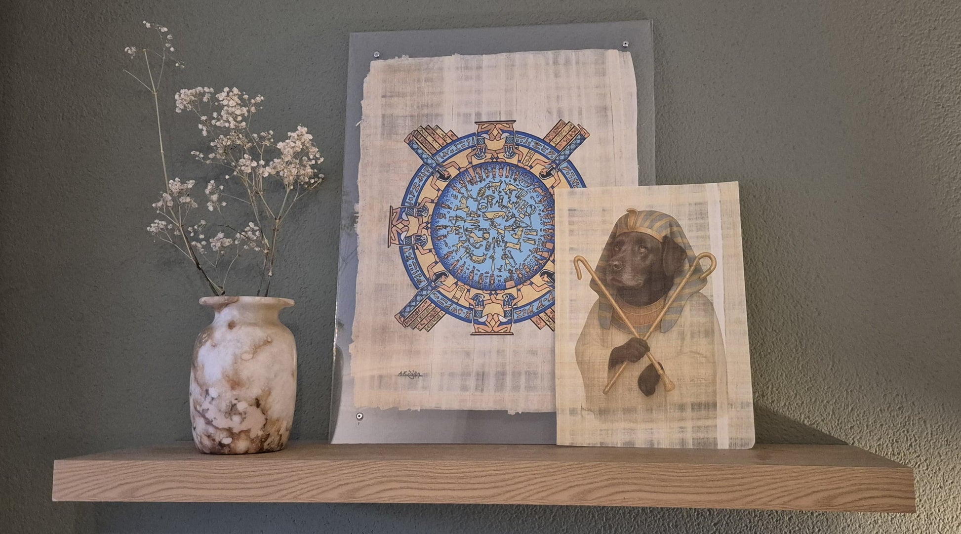 Onze farao Lizzy wordt prachtig weergegeven op dit bijzondere portret. Op papyrus, voor minder doet ze het niet! Mooi verpakt met een op haar afgestemd kaartje erbij. Een heel mooi sieraad om boven haar vaste plekje te hangen!